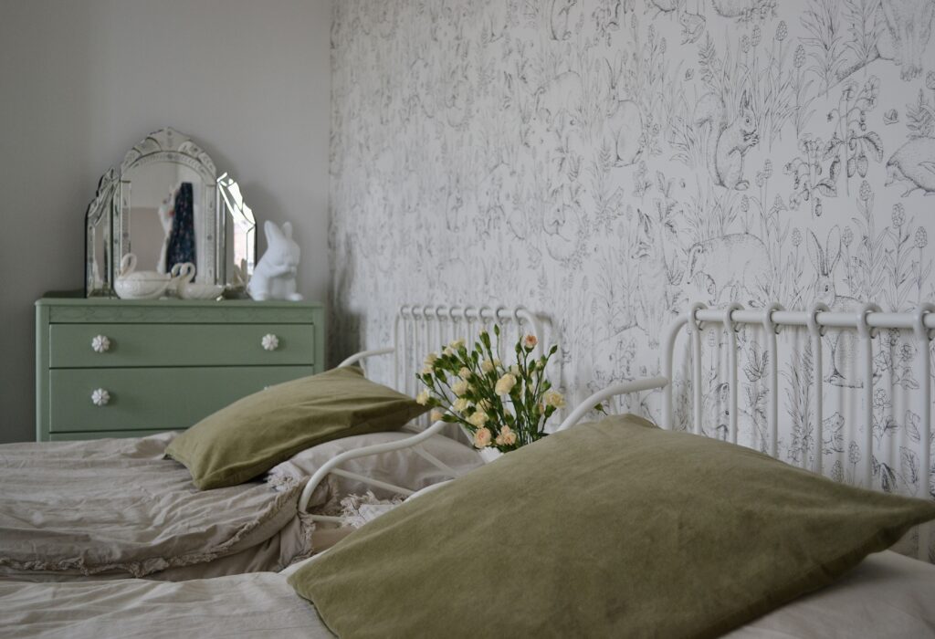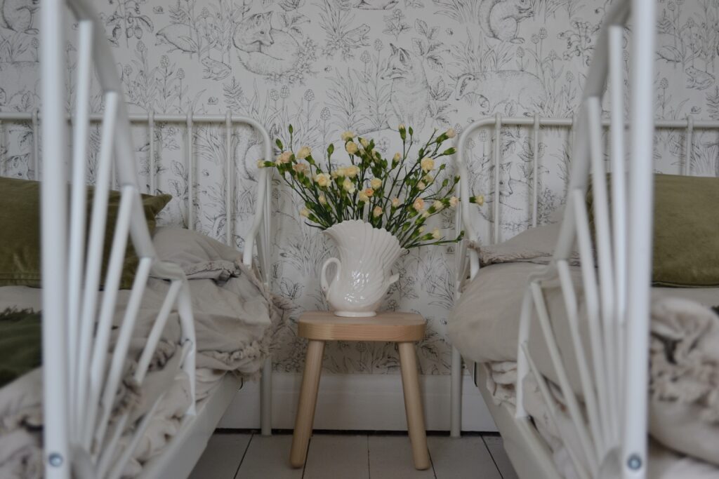 More often than not we also have flowers in every room of the house which sounds very  extravagant, but it’s not really, given that we live in a two up two down, and they are always simple inexpensive arrangements, usually in muted tones with lots of green. I try to buy flowers that are local and in season, which is something I feel we should try to consider as much a possible but with 90% of flowers sold in the UK being imported it can be tricky. One of my favourite places to put out flowers in our home is in the children’s room. It fills them with so much joy and I hope that they will look back with fondness when they are older at the flowers that were always by their bedside.