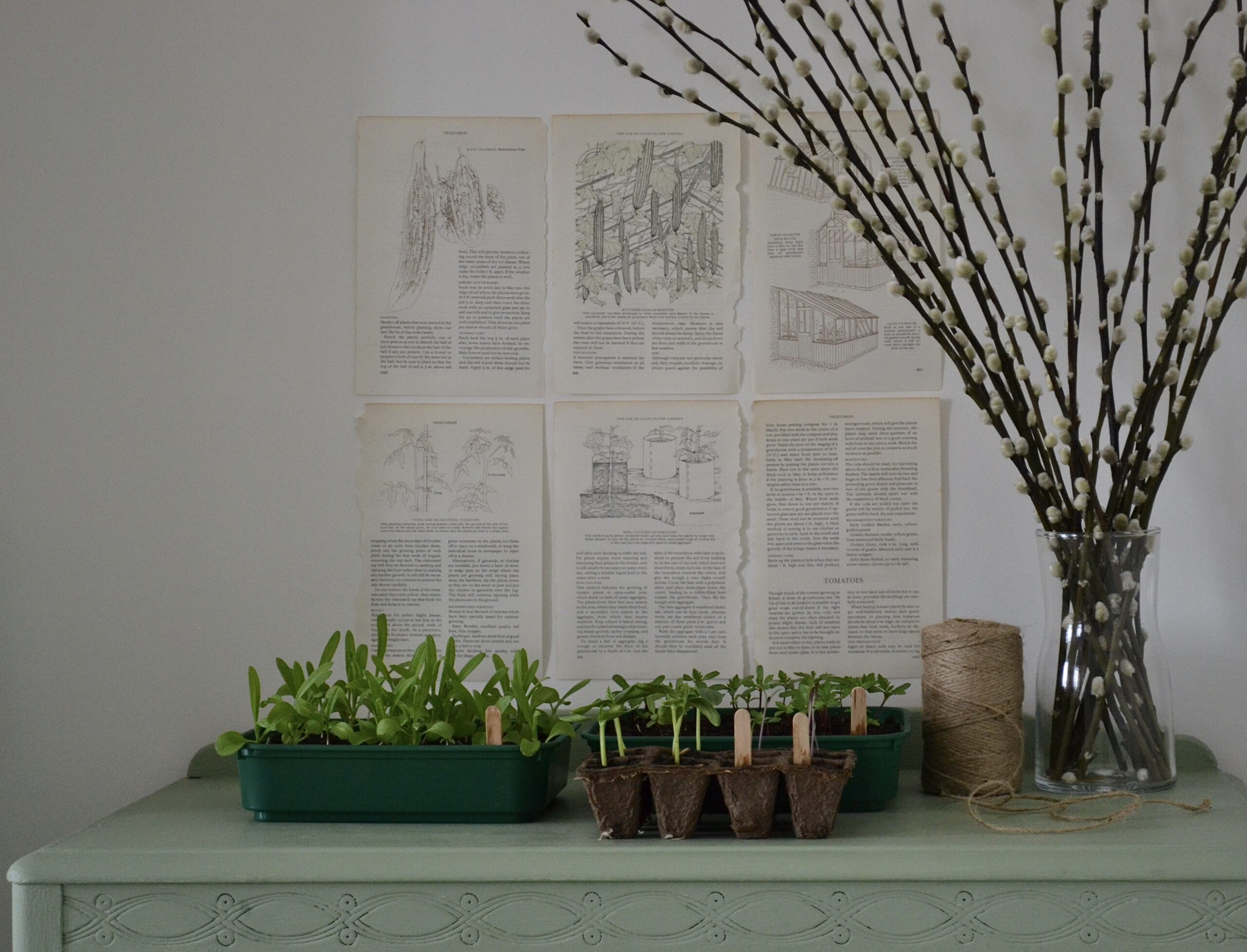 A sage green table top, with new plants growing out of nursery dishes. On the wall behind are 6 pages from a vintage plant growth book. Peeking in the frame to the right is a vase of tall stick-like plants without leaves. The colours are natural and muted, creating a relaxed feel.