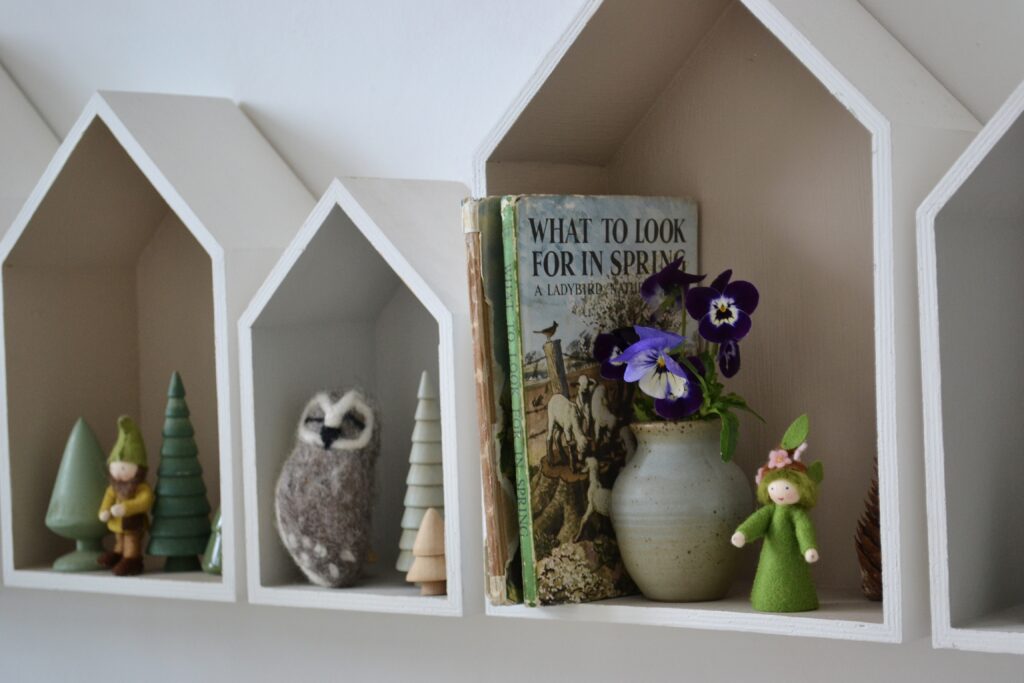 Around the time of the changes in the four seasons throughout the year is the time when I will switch over the children’s nature area in their room. For example, for Spring Equinox I will display Spring blooms, Spring fairies and toy figures for them to play with such as lambs and rabbits and baby chicks etc. Whereas in Autumn I will change up the area with golden tones, home grown gourds and Autumn leaves, Autumn fairies and woodland toy figures such as the squirrel etc. Doing this means that they continually have seasonal elements within their surroundings and play, which in turn, means that it is within their consciousness and their hearts!
